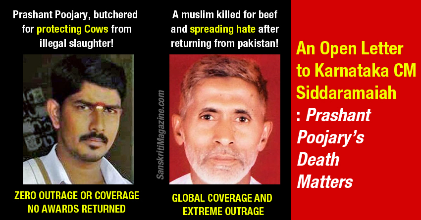 I would like to bring to the kind attention of Karnataka’s CM the way in which the narrative of the Dadri incident was painted and created by The Hindu. The “allegedly” highly reputed newspaper had no qualms in mentioning the religion of the mob that “allegedly” attacked Akhlaq. Actually, the glorious newspaper did not mince words. It clearly stated that a “Hindu and anti-national” mob murdered Akhlaq. No “presumption of innocence before being proven guilty” privileges were afforded to the “mob”. The Hindu’s Chapal Mehra went so far as to defend beef-eating as a normal “Hindu practice” that contemporary Hindus have “conveniently” forgotten. Mehra continues to narrate that beef-eating was not introduced in India by Muslims. The cow has been incorrectly appropriated as the national animal that defines India, Hinduism, and Majoritarianism. All of these things, according to Mehra, put India’s delicate yet unique plurality at risk. This is how the “Left” views the Dadri incident. The same “Left” also sees Prashant Poojary’s “alleged” murder as just a random death that has nothing to do with the debate regarding what it means to be Indian.