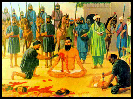 Banda Singh’s 4 years old son was seated on his lap. A dagger was given to Banda Singh and ordered to cut his own son. He refused. The executioner pierced the chest of his son, took out the violently vibrating heart and tried to push into the mouth of Banda Singh. Though shackled, Banda Singh refused furiously. After this his flesh was notched out with pliers, hot sharp rods were inserted into his flesh. His eyes were notched out, hands and feet were chopped off. Thus when he became unconscious, his head was chopped off. This black day of the rulers was on 9th June 1716.