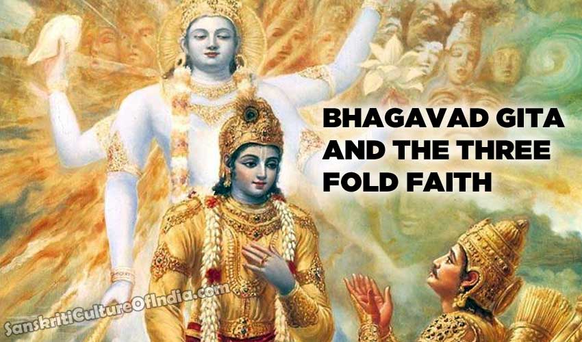 Lord Krishna`s invaluable discourses delivered to Arjuna while in the battleground of Kurukshetra, has today made up the Bhagavad Gita in its colossal form. The Gita with its 700 verses tries in several forms to explain perhaps one single notion, attaining a godly status by following a righteous path. Arjuna`s utter miserable state, his desperateness, his vulnerability in the battlefield was entirely covered up by Lord Krishna, his charioteer. Krishna`s preachings, sermons or his admonitions, leading to his cosmic vision, the Vishvarupa, made Arjuna realise the truth of life, divinity and performance. Krishna had once before, in the Gita context, explained to Arjuna the three basic qualities of purity, passion and ignorance and its outcome in daily existence. In the present context, threefold faith in Bhagavad Gita are described as those three qualities and its effect upon a man`s faith.