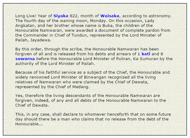 In his examination, Postma learned that the inscription was a pardon from the Chief of Tondo that erased the debt of a man named Namwaran. His debt was one kati and eight suwarna, or about 926.4 grams of gold. Today in 2006, this is equal to about $18,600 Canadian.