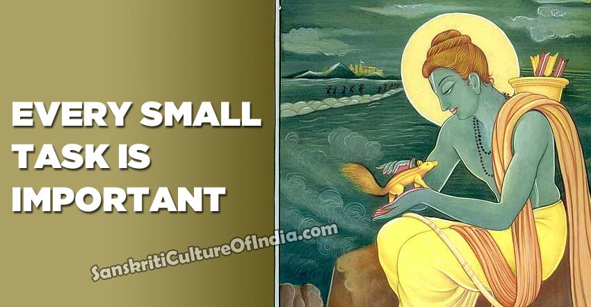 Hearing this, the Vanaras were ashamed, and bowed down their heads. Rama continued, “Always remember, however small, every task is equally important. A project can never be completed by the main people alone. They need the support of all, and however small, an effort should always be appreciated!”