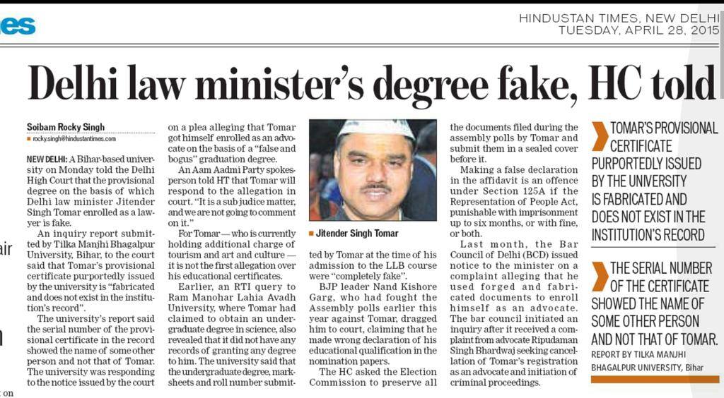 Tilak Manjhi Bhagalpur University filed an affidavit stating Tomar’s provisional certificate is “fabricated and doesn’t exist in their record.” The university said the roll number cited by Tomar is also incorrect. “As per records, the provisional certificate with serial number 3687 was issued on July 29, 1999 to Sanjay Kumar Chaudhary for BA (honours) in political science. The certificate in Jitender Tomar’s name is a fabricated document and does not exist in the university’s records,” the affidavit filed before Justice Rajiv Shakdher stated.