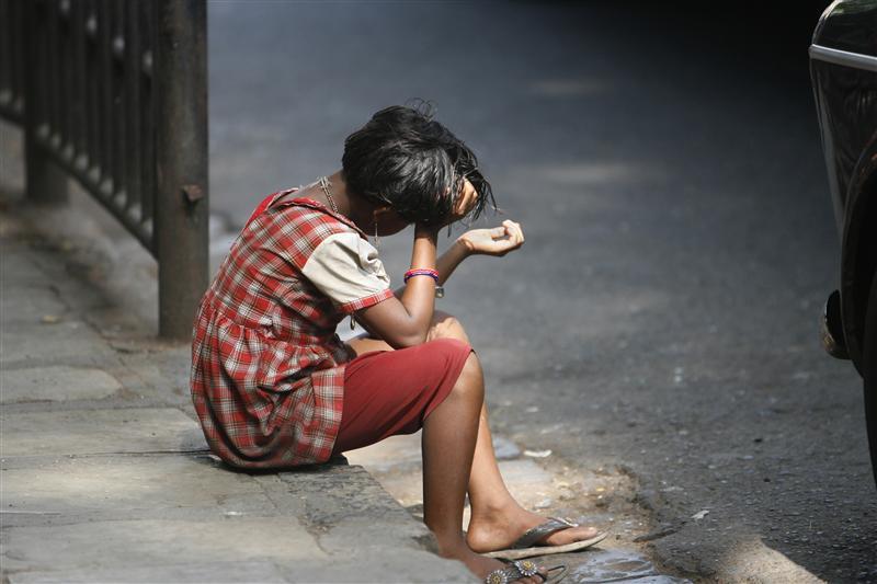 A girl sits on a pavement waiting to receive alms at a street in Mumbai