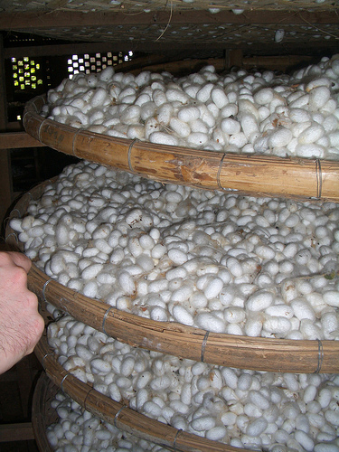 A female moth will lay around 400 eggs at a time (Handcrafted-silk-pillows.com, on-line), around 85 per cent of which will hatch. In nature, this would occur in spring, but in captivity the insects are kept in a controlled environment and therefore the farmers are able to control how often breeding occurs. After a week, the eggs hatch to reveal larvae (around 3 mm in length), who will begin to feed on the mulberry leaves provided. During the next four weeks, the larvae will continue to eat until they have grown 10,000 times their original size. Once fully grown, the larva is ready to begin weaving his cocoon. He attaches himself to a twig (or artificial replacement) and begins to secrete liquid silk from his glands, which is forced through openings in his head called spinnerets. He also secretes seracin (a protective gum) and, upon contact with the air, the liquid silk becomes a silk filament. The larva wraps the filament around his body in a figure of eight movement and within three days he is completely contained within his cocoon. The cocoon is made from a single continuous thread that can be up to one mile in length.